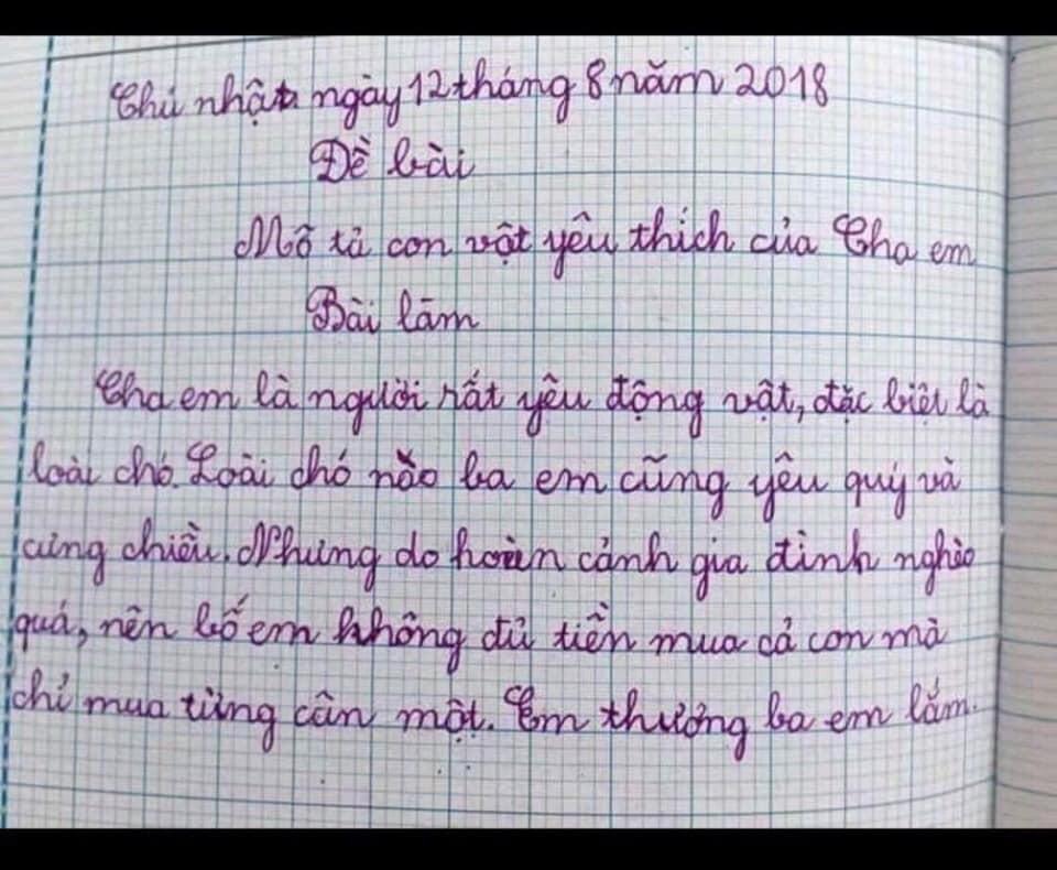 Còn bài văn đôi ba dòng của cậu học sinh đây lại kể rằng nhà nghèo đáng thương nhưng ai cũng thấy… sai sai. "Cha em là người rất yêu động vật, đặc biệt là loài chó… Nhưng do hoàn cảnh gia đình nghèo quá nên bố em không đủ tiền mua cả con mà chỉ mua từng cân một". Tình yêu chó của ông bố thật khiến dân tình "cảm động"!