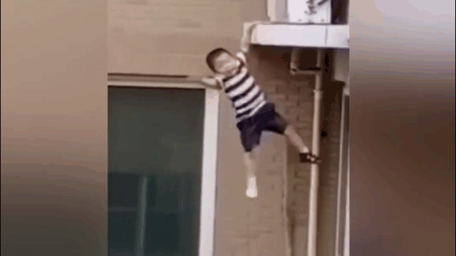Hình ảnh ghi lại được cho thấy, một bé trai đang bám trên mép ban công của một căn hộ. Trong khi đó, một vài người dân đang đứng phía dưới giơ sẵn hai tay để sẵn sàng đỡ lấy cậu bé.