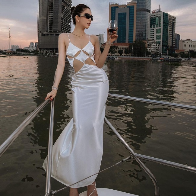Điều đáng chú ý là váy lụa cắt xẻ táo bạo để lộ chân ngực gợi cảm và phần eo săn chắc.