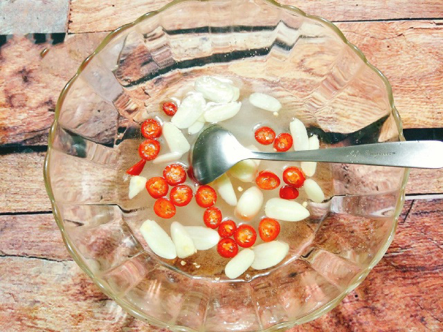 Bước 4: Pha hỗn hợp giấm đường, bạn chỉ việc cho giấm và đường vào 1 cái âu rồi khuấy đều cho tới khi đường tan hết là được, tiếp theo bạn cho ớt và tỏi vào cùng.