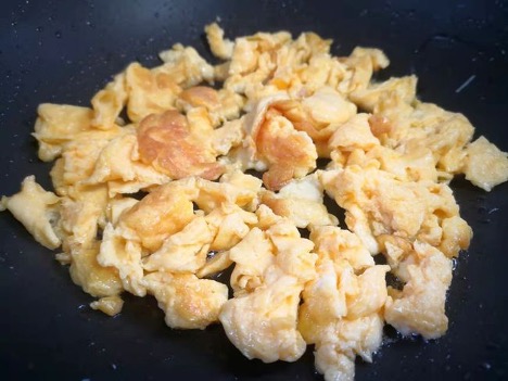 Bước 4: Đổ một lượng dầu thích hợp vào chảo đun nóng, sau đó đổ trứng vào, xào 1 lúc cho trứng chín rồi để riêng ra ngoài.