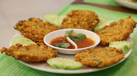 Chả bắp chiên thịt với lớp vỏ giòn kết hợp phần nhân thịt dai và vị ngọt của bắp rất ngon miệng.