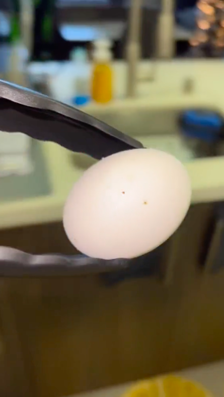 Quả trứng khi máy chạy xong không “bị nổ” như nhiều người mường tượng, vẫn còn nguyên vẹn, cô gái lấy ra ngâm vào bát nước lạnh vài phút cho dễ bóc