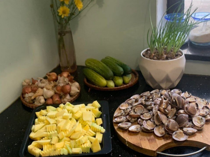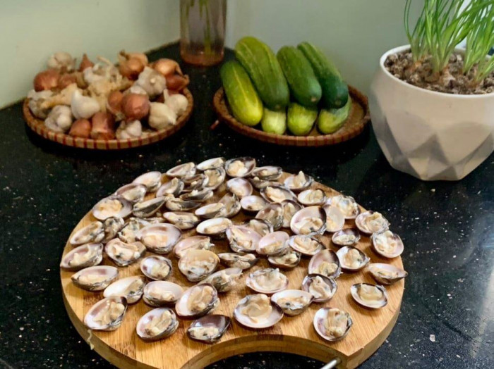 + Bỏ bớt 1 phần của vỏ nghêu, rồi cho phần nghêu vào một cái âu lớn.