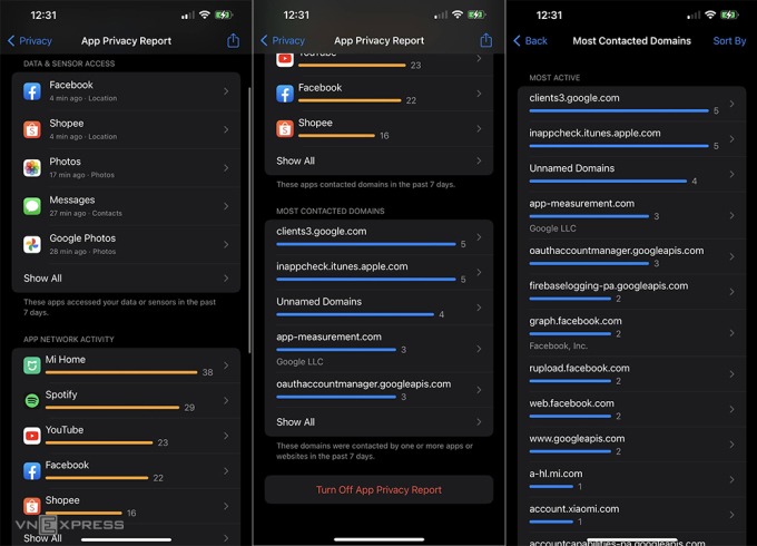 Tính năng App Privacy Report, khi được kích hoạt, sẽ ghi lại mỗi khi một ứng dụng truy cập vào dữ liệu nhạy cảm như ảnh, vị trí, thông tin liên hệ hay khi camera, microphone được sử dụng. Công cụ lưu lại lịch sử hoạt động của các ứng dụng trong vòng 7 ngày.