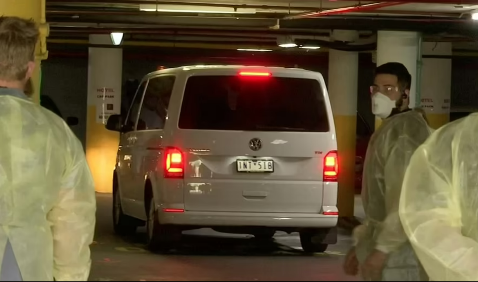 Chiếc xe được cho đưa Djokovic và các thành viên ban huấn luyện rời sân bay Melbourne, đến khách sạn cách ly
