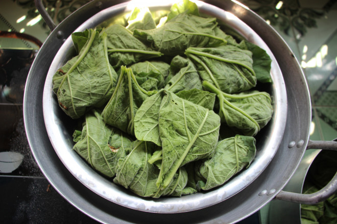 Sau đó, tiến hành hấp cách thủy tầm 5 phút. Vị béo của sữa ong non hòa quyện cùng vị ngọt thanh của lá bầu kết hợp chút mặn, chua, cay của muối ớt tắc đã tạo món ăn "có một không hai" trong lòng du khách.