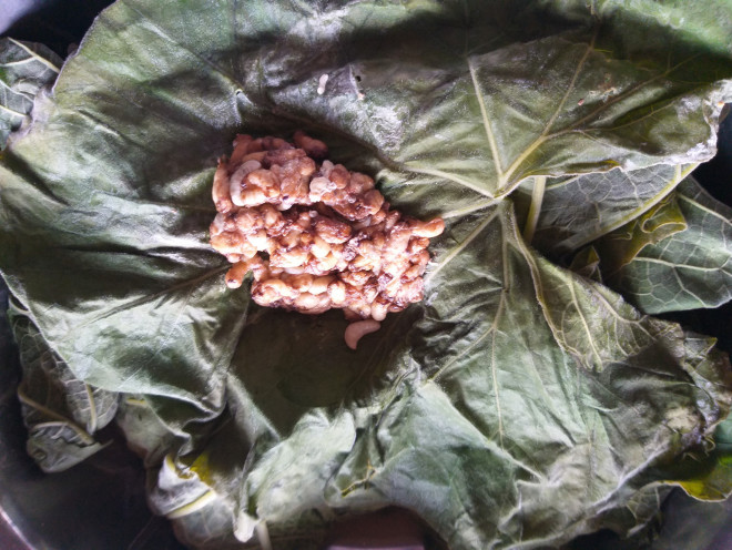 Nhộng ong sau khi để ráo nước được cho vào lá bầu, gói lại