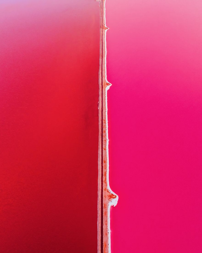 Muối hồng trên bờ hồ lấp lánh như tuyết và tất cả trông giống như những bức tranh trừu tượng. Trong trường hợp này, thiên nhiên và màu sắc đã làm nên điều kỳ diệu.