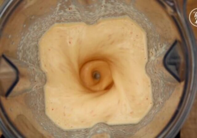 Cho nước cốt dừa, 80g hành tím, 30g tỏi tép, 15g ớt quả, 30g riềng, 15g ớt khô, 30g gừng thái lát và 50g sả vào máy xay sinh tố xay nhuyễn. Đổ hỗn hợp xay vào một cái bát.