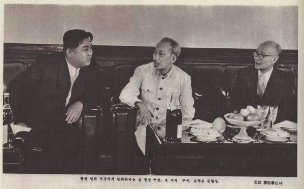 Thủ tướng Kim Nhật Thành (bên trái) và Chủ tịch đảng Tân nhân dân Kim Tu Bong (bên phải), tiếp Chủ tịch Hồ Chí Minh thăm hữu nghị chính thức Triều Tiên năm 1957. Cả 3 đàm đạo không cần phiên dịch vì đều thông thạo Hán ngữ!