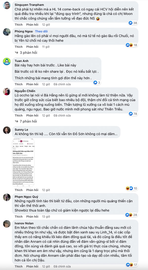 Nhiều người không hiểu não họ nghĩ gì Đám nghệ sĩ thì cống hiến được gì mà suốt ngày mở miệng nói cống hiến cho nền văn hóa nước nhà. Họ diễn thì bán vé thu tiền, ai nói trái ý thì chửi thẳng mặt khán giả, sống xa hoa là nhờ khán giả mà miệng bảo khán giả không nuôi sống họ. Trong khi Cô Hằng cống hiến tiền của cho hoạt động thiện nguyện, cho xã hội thì tụi báo chí, nghệ sĩ và tụi lươn dập không thương tiếc. Cô Hằng lên tiếng được lợi lộc gì cho cô ấy hay nhờ Cô mà mọi người mới sáng mắt ra là trên đời không có "thần y" nào chữa được bệnh bằng cách "đập" bệnh nhân, không có chuyện đã đứng ra kêu gọi từ thiện mà không công khai minh bạch, không thể nào ôm tiền cứu trợ lũ lụt mà ngâm 6 tháng trời đến khô ráo, bị tố mới đem ra giải ngân. Không hiểu kết quả này là thế nào nhưng chưa bao giờ tin đám nghệ sĩ giả tạo.