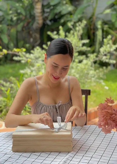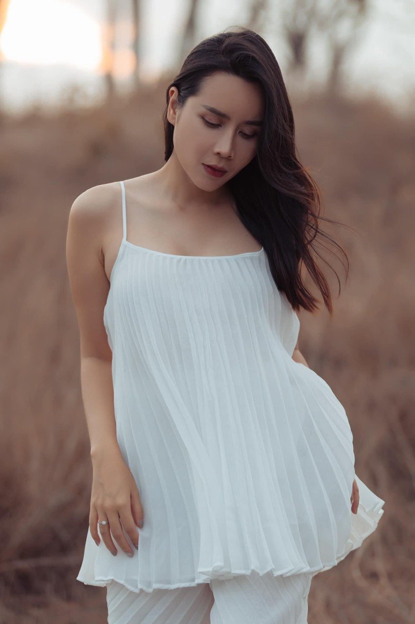 Váy hai dây không kén dáng của bà xã Hồ Hoài Anh dễ sử dụng khi đi nghỉ dưỡng hoặc làm việc ở nhà. Cô thường chọn thiết kế đơn sắc cho những chiếc váy như thế này.