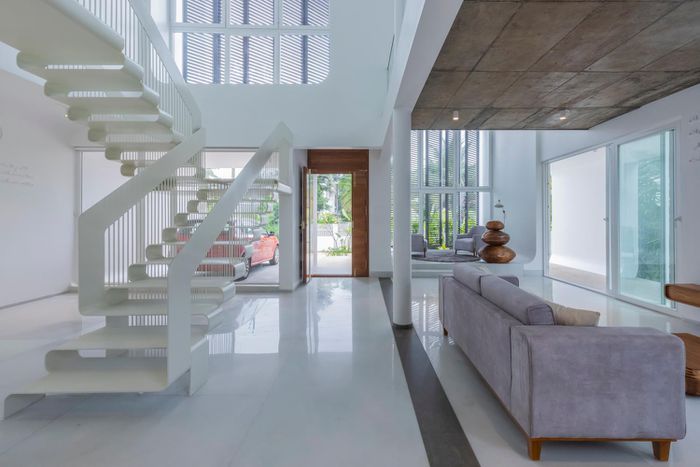 Thay vì xây tường bịt kín ở mặt tiền, kiến trúc sư sử dụng các cửa chớp có trục xoay để thông gió cho toàn bộ ngôi nhà làm mặt tiền.