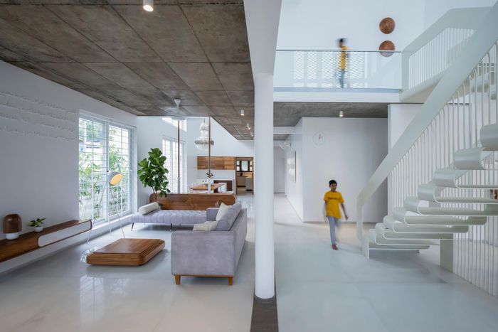Phòng khách rộng lớn bên cạnh cửa sổ bằng kính để lấy ánh sáng và gió tươi thay cho giếng trời.