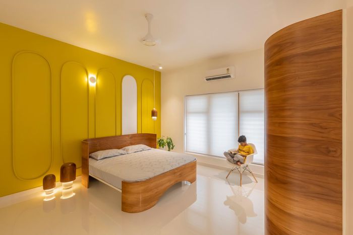 Phòng ngủ của trẻ em được nhấn nhá bằng bức tường màu vàng.