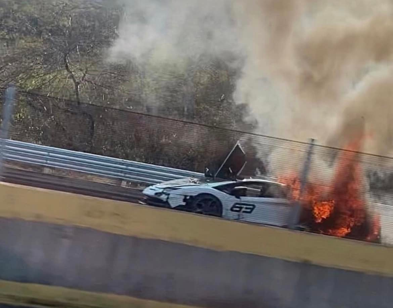 Hình ảnh chiếc Lamborghini SVJ 63 Roadster bốc cháy trước khi ngọn lửa lan đến phần đầu xe (Ảnh: Motor1).