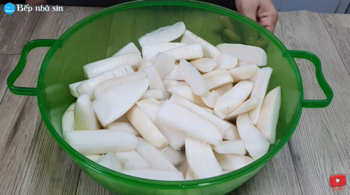 Củ cải đã thái đem ướp muối trong 1 giờ cho ra nước và rửa hết mặn.