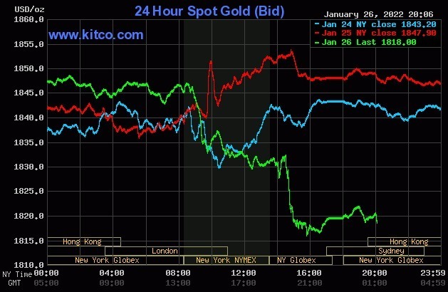 Chốt phiên giao dịch ngày 26/1, giá vàng thế giới giao ngay mất 28,5 USD xuống 1.819 USD một ounce. Giá giảm do đôla Mỹ và lợi suất trái phiếu chính phủ Mỹ tăng sau khi Chủ tịch Cục Dự trữ liên bang Mỹ (Fed) Jerome Powell cho biết "có thể" nâng lãi trong cuộc họp giữa tháng 3.
