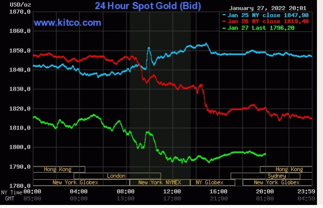 Chốt phiên giao dịch ngày 27/1, giá vàng thế giới giao ngay mất 22 USD, còn 1.797 USD một ounce. Trong phiên, giá có thời điểm xuống thấp nhất 2 tuần tại 1.790 USD.