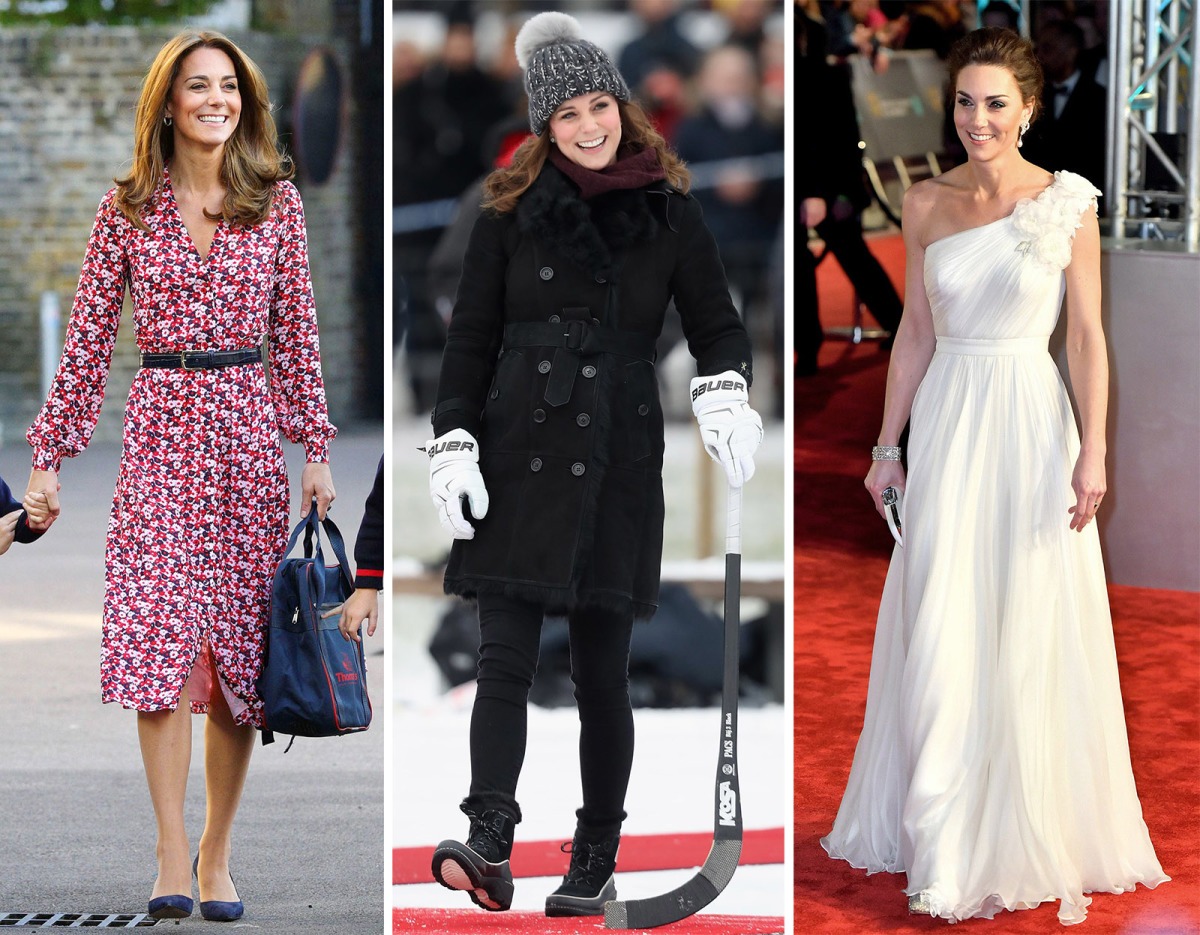 Mỗi lần xuất hiện trước công chúng, Kate thường được khen ngợi nhờ cách chọn trang phục khéo léo, phù hợp tính chất sự kiện cũng như bối cảnh xung quanh. Khi đưa George và Charlotte tới trường nhân dịp khai giảng năm 2019 (ảnh trái), bà mẹ ba con diện váy hoa nhẹ nhàng giá 175 USD của Michael Kors. Cô chuyển sang hình ảnh năng động, gần gũi khi tham dự một sự kiện hockey tại Thụy Điển (ảnh giữa), rồi tỏa sáng lộng lẫy với xiêm y Jenny Packham trên thảm đỏ BAFTAs 2019.