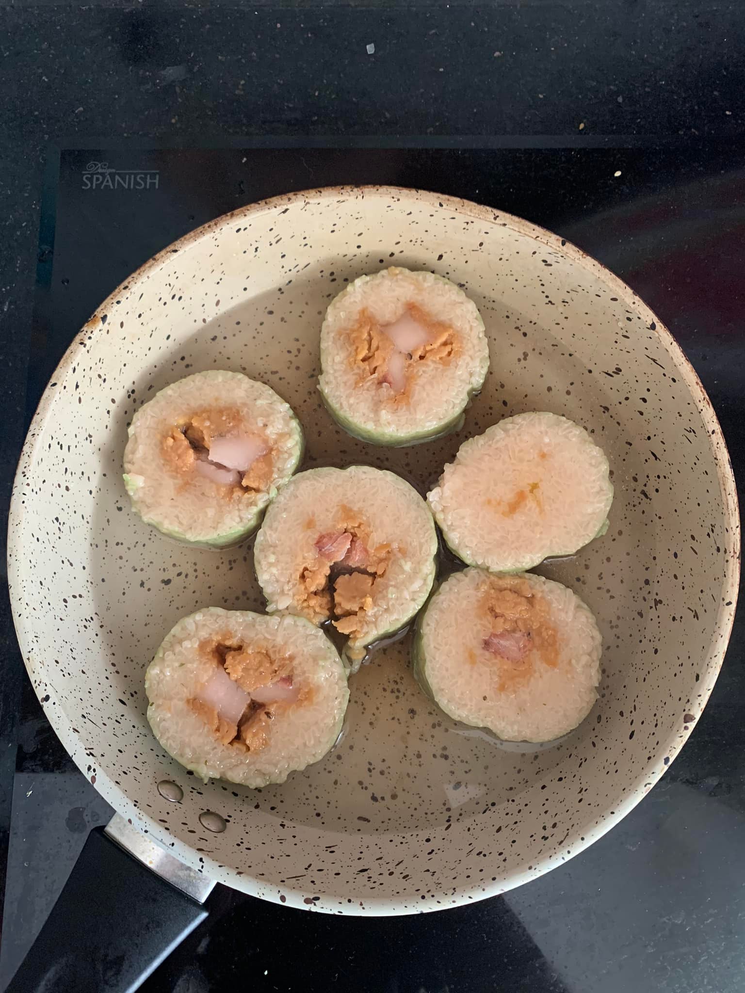 - Cắt bánh, xếp vào chảo, đổ nước sâm sấp ngang mặt bánh