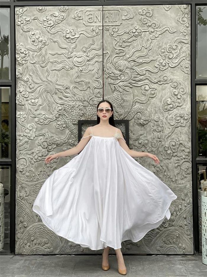 Không cần cầu kỳ, chỉ với chiếc váy hai dây trắng, suông rộng, Linh Nga thướt tha và vô cùng quyến rũ.