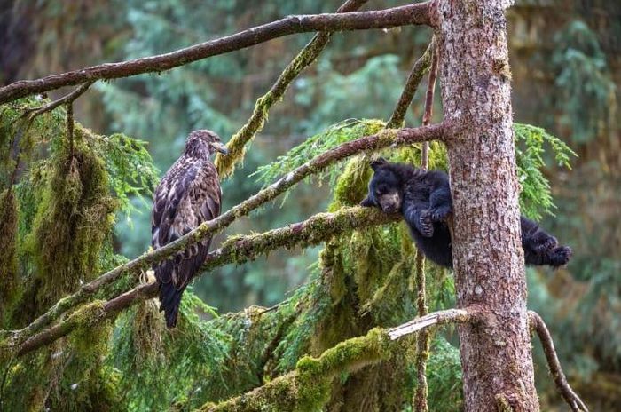 Một con đại bàng đầu trọc chưa trưởng thành và một con gấu đen còn nhỏ tạo thành "cặp đôi hoàn cảnh" ở bang Alaska của Mỹ. Ảnh: Jeroen Hoekendijk.