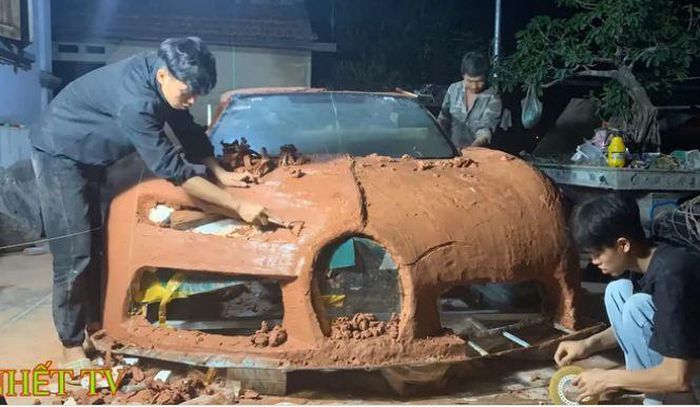 Trong đoạn video tung lên mạng xã hội, bước đầu tiên trong quá trình tự chế Bugatti Chiron là dựng khung bằng thép. Sau đó, nhóm bạn trẻ dùng băng dính để quấn xung quanh phần khung nhằm tạo hình cơ bản. Rồi trám đất sét lên phần khung đã được quấn băng dính. Tất cả đều được các bạn trẻ làm bằng tay và thực hiện rất tỉ mỉ.