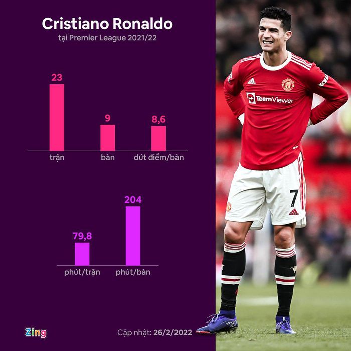 Thống kê của Ronaldo giảm mạnh so với các mùa trước. Đồ họa: Minh Phúc.