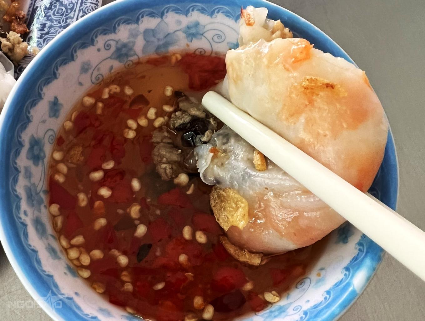 Nước mắm là điểm nhấn của món bánh cuốn này. Nước mắm chua ngọt, nêm nếm vừa vẹn đựng trong chai riêng. Khách tự thêm ớt tùy sở thích ăn cay. Khi ăn, thực khách chan nước mắm lên bánh, hoặc chấm bánh vào mắm rồi nhâm nhi vị ngọt của tôm luộc, củ sắn bào, thịt heo béo nhẹ, bánh đậu chiên giòn bùi và hành phi thơm. Phần ăn đầy đủ giá 32.000 đồng, thêm tôm giá 10.000 đồng, đủ cho một người no bụng buổi sáng.