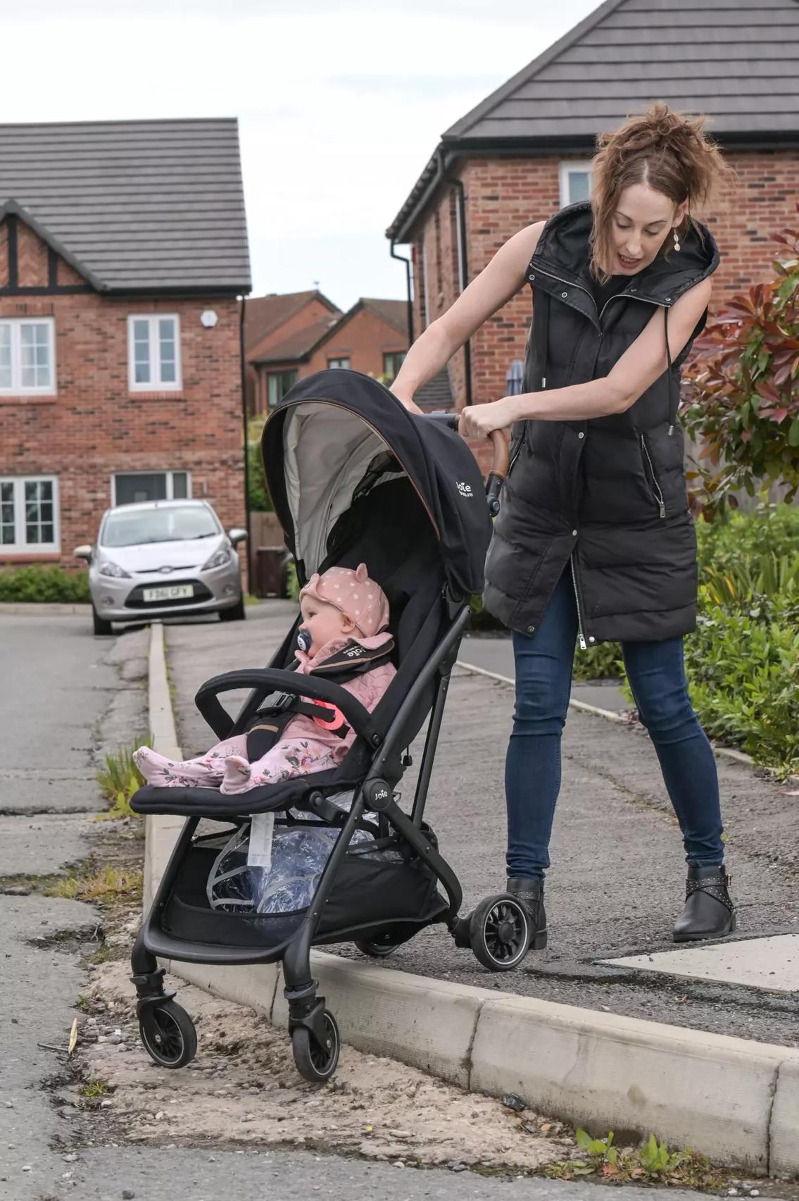 Con gái của chị Rachel Hopkins suýt bị văng khỏi xe đẩy vì không có lối lên xuống vỉa hè.