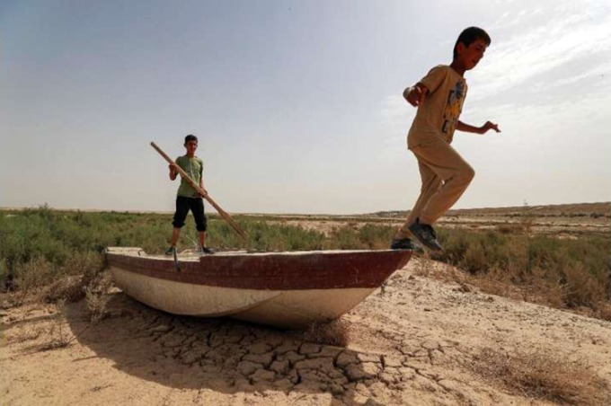 Trẻ em chơi đùa trên một chiếc thuyền đánh cá mắc kẹt dưới đáy hồ Hamrin cạn khô. Ảnh: AFP