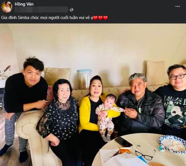 Chia sẻ trên trang cá nhân, Hồng Vân hào hứng đăng bức hình mọi người chụp cùng em bé, kèm chú thích: “Gia đình Simba chúc mọi người cuối tuần vui vẻ ạ”. Trong hình, ngoài Hồng Vân, khán giả có thể dễ dàng nhận ra sự xuất hiện của mẹ ruột nữ nghệ sĩ, con trai cô là Trê Phi, con rể và đặc biệt nhất chính là ông xã Tuấn Anh.