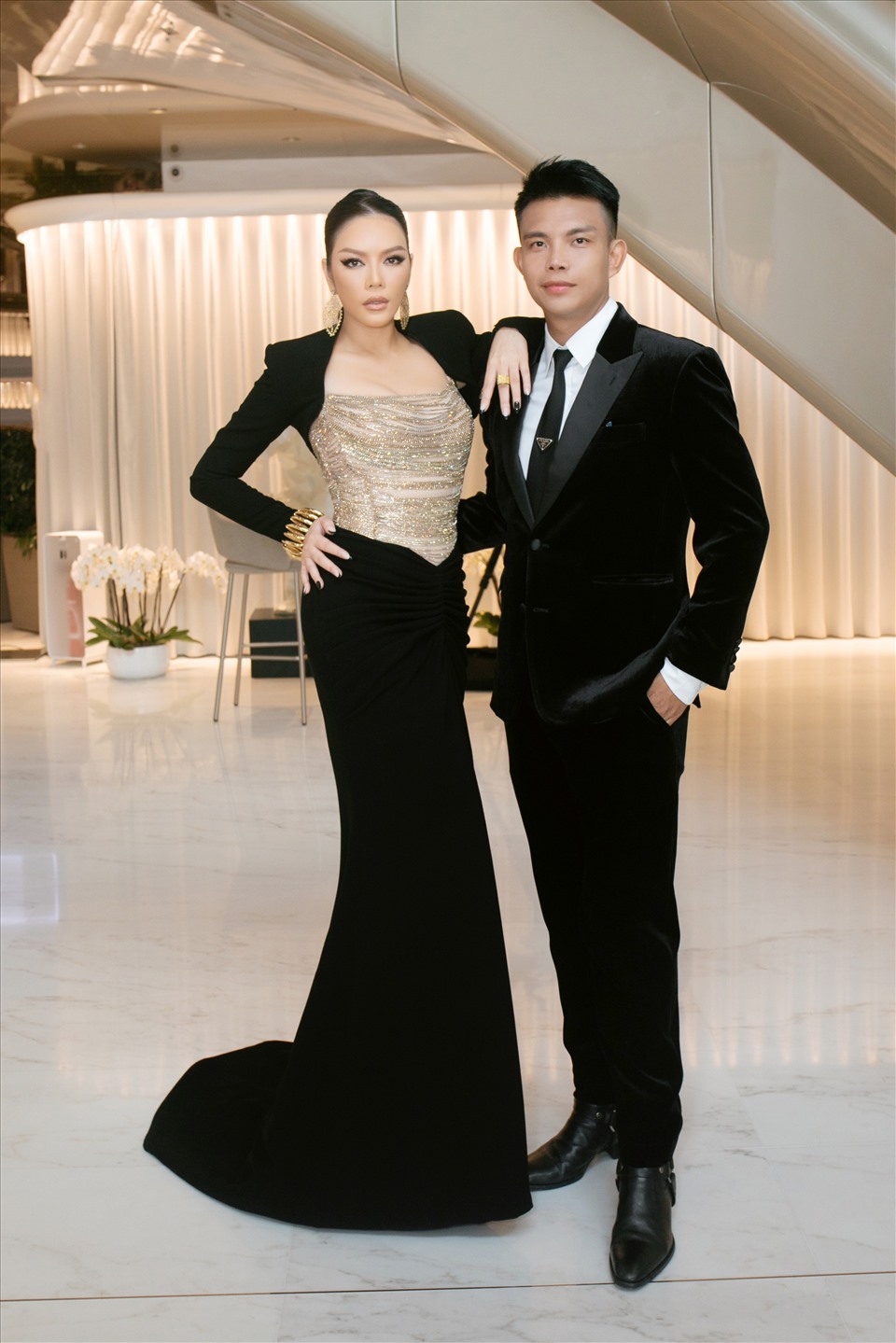 Mẫu thiết kế được lấy cảm hứng từ thời trang thập niên 30. Phần ngực áo đính kết từ những dây đá kim loại.