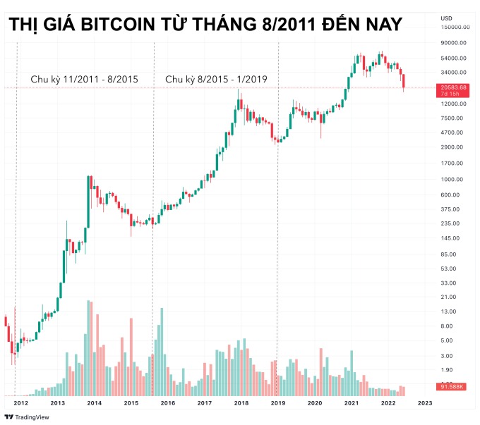 Bitcoin đã từng tạo đáy sâu vào tháng 11/2011 và tháng 8/2015, lập đỉnh cao vào tháng 11/2013 và tháng 12/2017, nếu tính theo chu kỳ 4 năm. Ảnh: Tranding View