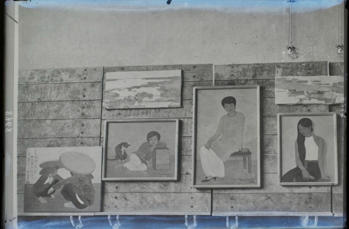 "Đôi bờ sông Hồng" (phía trên, bên trái) bên các tác phẩm của họa sĩ Việt dự Triển lãm Thuộc địa tại Paris năm 1931. Ảnh: Ngô Kim Khôi cung cấp