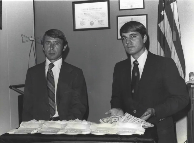 Hai đặc vụ FBI bên số tang vật thu được khi bắt giữ Mark Stanley Rifkin. Ảnh: Jerri Wlliams