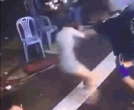 Tuy không đánh lại được đối phương, cô gái vẫn không hề sợ hãi mà chống trả lại một cách ác liệt. Trong khi đó, người bạn trai lại khá yếu thế, anh dường như không hề chống cự khi bị đánh nhiều lần. Khi hai người đàn ông quay lưng bỏ đi, cô gái lập tức kéo bạn trai đứng dậy, người cầm ghế, người cầm bàn đuổi theo và hai bên tiếp tục đánh nhau.