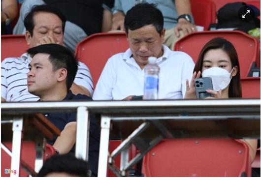 Thời điểm đó, Đỗ Mỹ Linh ngồi cạnh Chủ tịch CLB Hà Nội ở hàng ghế VIP. Cả hai nói chuyện vui vẻ, thân thiết.