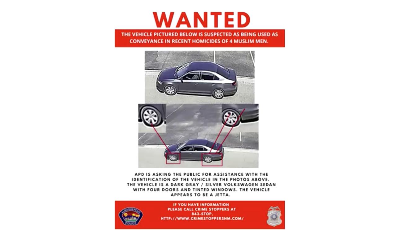 Cảnh sát thông báo hôm thứ Ba rằng họ đã bắt giữ một “nghi can chính” trong vụ giết hại bốn người đàn ông Hồi giáo ở Albuquerque, New Mexico, và cái chết của họ đã gây ra nỗi sợ hãi trong các cộng đồng Hồi giáo trên toàn quốc. Cảnh sát trưởng Harold Medina đưa ra thông báo trên Twitter, nói rằng nhà chức trách đã tìm ra một chiếc xe được cho là có liên quan đến một trong những vụ giết người ở thành phố lớn nhất New Mexico.