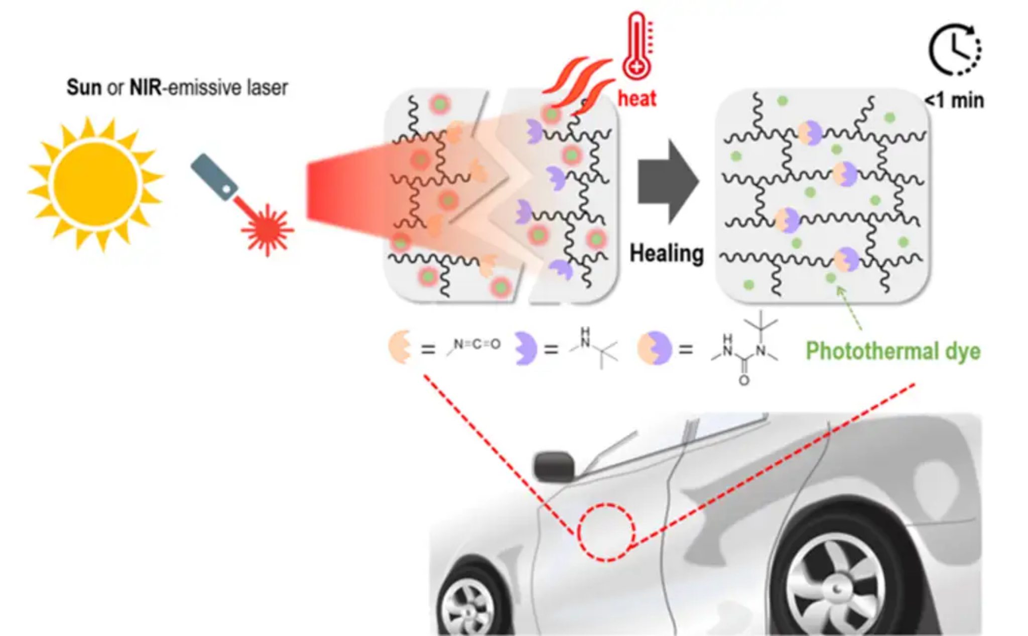 Chính lớp nhuộm này sẽ hấp thụ ánh sáng hồng ngoại từ mặt trời và chuyển hóa thành năng lượng nhiệt. Các kết nối hóa học giữa cấu trúc polymer sẽ phản ứng với nhiệt, phân rã rồi tự kết hợp lại, dần dần phục hồi các cấu trúc polymer bị tổn hại (ở đây là các vết xước) cho đến khi nó trở lại hiện trạng ban đầu.