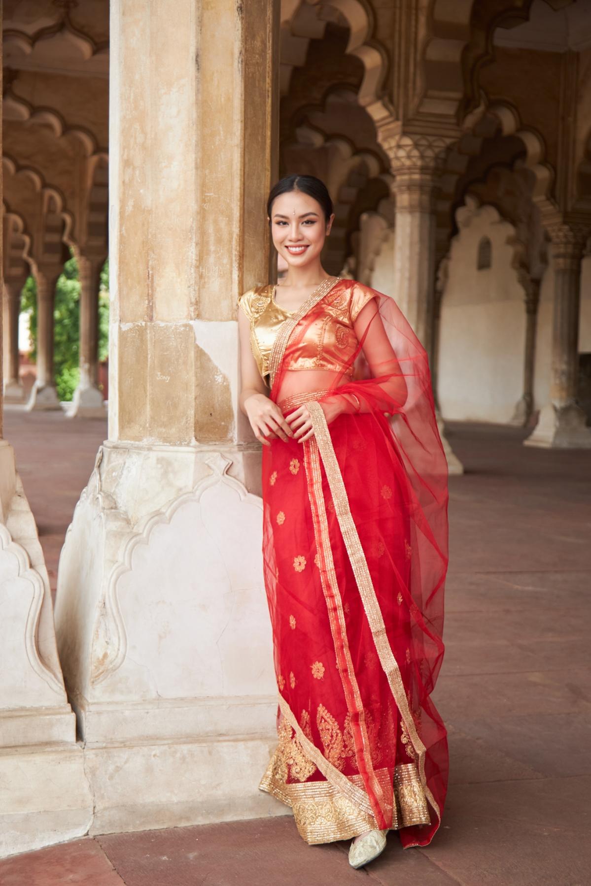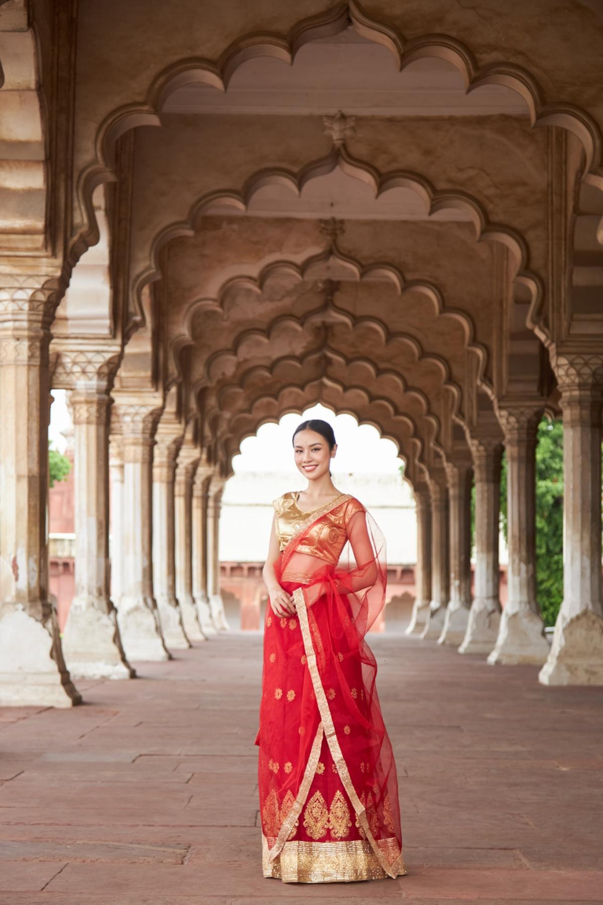 Với tone màu đỏ và vàng đồng của bộ trang phục, nàng hậu Thủy Tiên nổi bật giữa không gian kiến trúc của Taj Mahal và Red Fort.