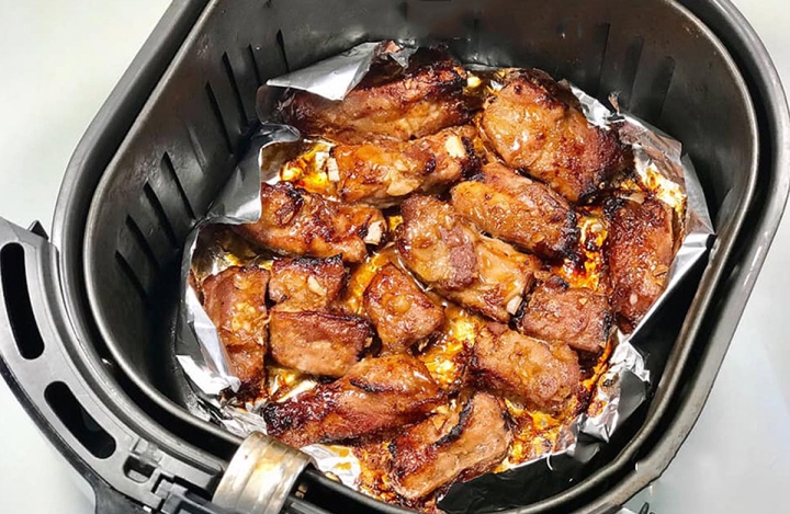 Lót giấy bạc vào khay của nồi chiên không dầu, xếp thịt lên, lưu ý không xếp chồng lên nhau; cài đặt nhiệt độ 200 độ C, nướng trong 12 phút
