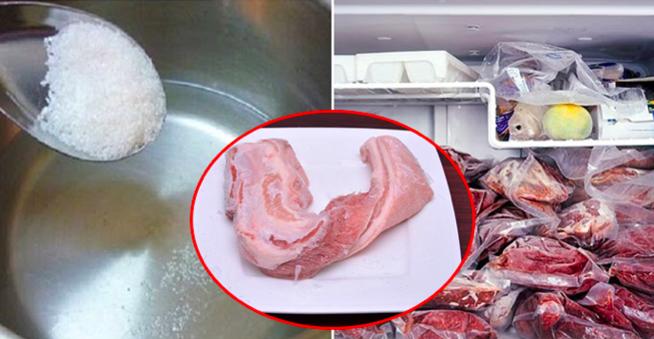 Trước tiên bạn chuẩn bị một chậu nước sạch, cho 1 thìa muối vào, cho thịt lợn đã đông lạnh vào và bắt đầu ngâm. Cách này giúp cho thịt lợn mềm trong khoảng 10-20 phút.