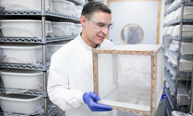 Giáo sư George Christophides bê hộp chứa muỗi. Ảnh: Đại học Hoàng gia London