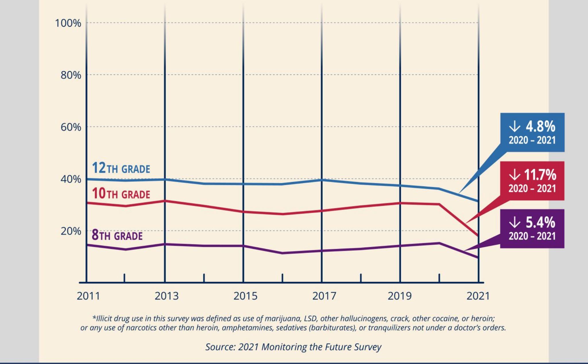 Theo đó tỷ lệ sử dụng chất gây nghiện ở nhóm này giảm dần đều, đặc biệt từ giai đoạn những năm 1990 đến giờ, tuy nhiên ở hướng ngược lại việc sử dụng cần sa và vape hay các dạng thuốc lá điện tử đã tăng mạnh. Một trong những điểm quan trọng của việc giảm sử dụng chất gây nghiện được ghi nhận đó là do giới trẻ có ít thời gian rảnh rỗi hơn và bị sự giám sát của cha mẹ nhiều hơn trước đây.