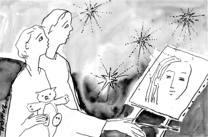 Những bức tranh của cô Mai vẽ xong để trong góc phòng. Chúng không có lời nói nhưng vẻ đẹp trong từng nét cọ cô ấy thảo ra, chúng như ngàn lời ca vang, như ngàn tiếng chim hót trong buổi bình minh. Vy nhìn những bức tranh của cô ấy, khi thì rực rỡ sắc màu trong vườn hoa, khi lại là màu xám của mặt nước mùa đông lạnh lẽo. Bức tranh đẹp nhất, Vy thấy, đó là một cô bé đứng ngoài ban công nhìn lên bầu trời đêm. Bức tranh như thể cô Mai đang vẽ về Vy vậy.