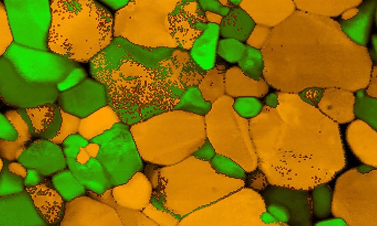 Các chuyên gia sử dụng silicon nitride để tạo ra những trụ nano chứa hai loại cấu trúc tinh thể (màu xanh lá cây và màu cam). Ảnh: Chen Kexin