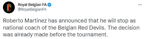 "Chúng tôi xin thông báo Roberto Martinez sẽ thôi dẫn dắt tuyển Bỉ sau World Cup 2022. Đây là quyết định đã được đưa ra từ trước giải đấu", LĐBĐ Bỉ (RBFA) chỉ dùng mạng xã hội để đưa tin thay vì đăng thông báo trên trang web chính thức.